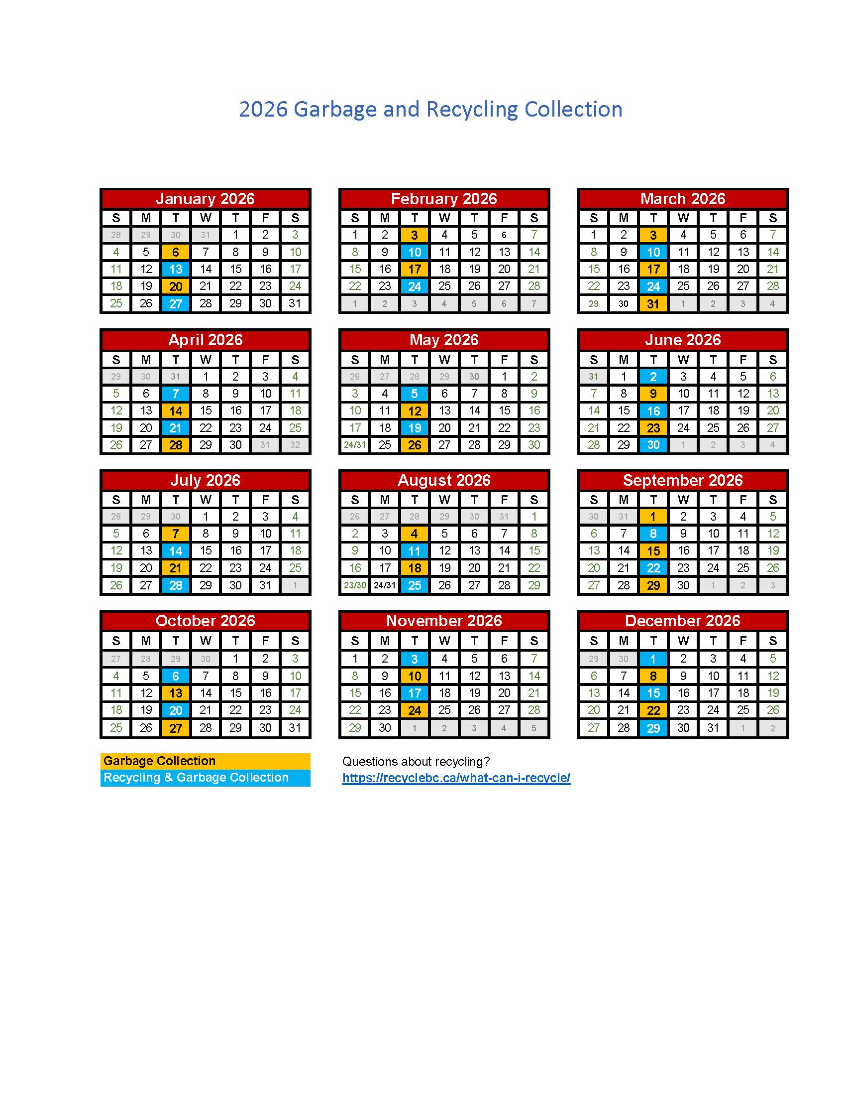 Municipal garbage collection is on Tuesdays. Your garbage must be out by 7:00 a.m. to guarantee collection but should not be placed curbside prior to 5:00 a.m. on collection day. If for any reason you feel that the contractor has missed you, call the office no later than 2:00 p.m. Staff will make every effort to contact the contractor but cannot guarantee a positive outcome. A printable pdf copy of the 2025 Garbage & Recycling calendar is available in colour or for printing in black & white.